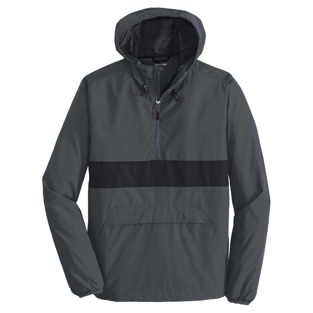 As a jacket for all seasons, the Sport-Tek Men's Graphite Grey/Black Zipped Pocket Anorak includes a large zippered pocket that stores your valuables. It is frustrating to hear the smartphone ring and not be able to retrieve it in time to take phone calls. The large zippered pocket runs across the front of the jacket to give you instant access to electronic devices. Sport-Tek goes beyond standard comfort features by adding a chin guard and three-panel hood. One-hundred percent polyester woven sleeve linings keep your arms warm. Optimize the marketing potential of the anorak by attaching your company logo to the large embroidery area.Highlights