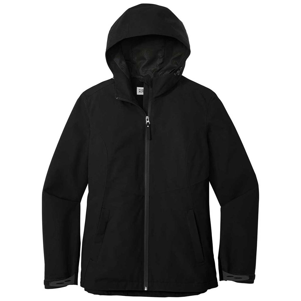 Make a statement with a custom embroidered Port Authority Women's Deep Black Tech Rain Jacket. Mother nature is no make for the 100% polyester canvas TPU laminate with a durable water repellant finish and polyester lining. Though lightweight, the jacket comes with attached adjustable hood, interior storm flap, chin guard, and zippered pockets. Add your company logo to use these rain jackets as employee gifts or as part of a give away at corporate events. Protect yourself and friends from the wind and rain at team events or as you head out to have dinner.Corresponding Men's Style:Port Authority Men's Deep Black Tech Rain Jacket