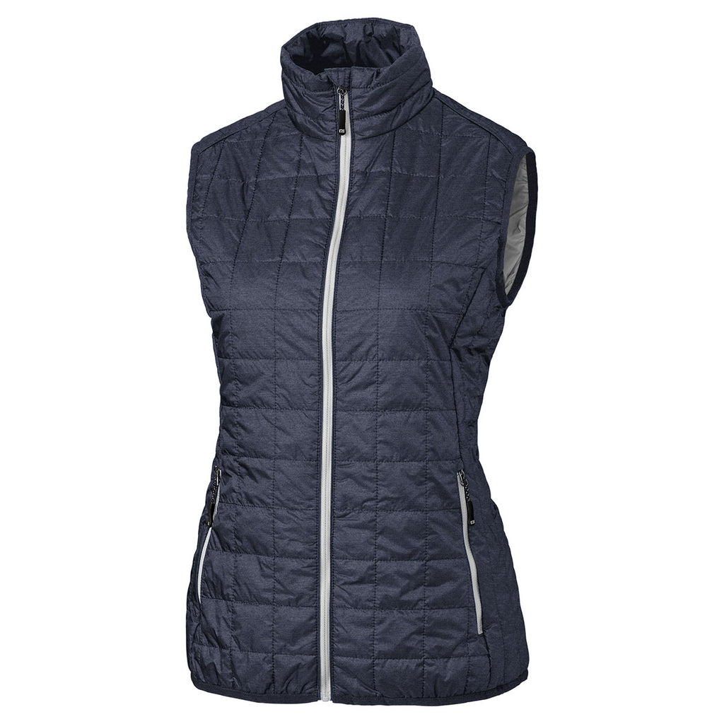 Quilted vests are in, and when you put your custom logo on this Cutter & Buck Women's Anthracite Melange Rainier Vest, everyone will know you are a company that keeps up with the times. It is insulted and made from easy-care taffeta. It has a mock turtle neck, full zipper front and front pockets with zippers. The wind will be kept at bay with the elastic bound armholes and hem. For your embroidered logo there is zip in lining for embroidery access. There is Primaloft fill that is packable into the left front pocket. This vest is machine washable in cold water on the delicate cycle.Corresponding Men's Style:Cutter & Buck Men's Anthracite Melange Rainier Vest