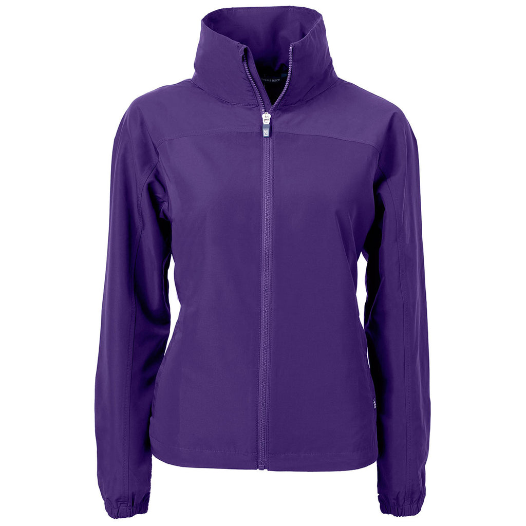 Cutter & Buck Women's College Purple Charter Eco Recycled Full Zip Jacket showcasing your custom logo will get you recognized at work or while out having fun. The full-front zip jacket is made of recycled materials with a water-resistant finish, a stowable hood, and an adjustable drawcord at the hem for an ideal fit. Great for outdoor adventures like camping, hiking, and backpacking. Order yours today.Highlights