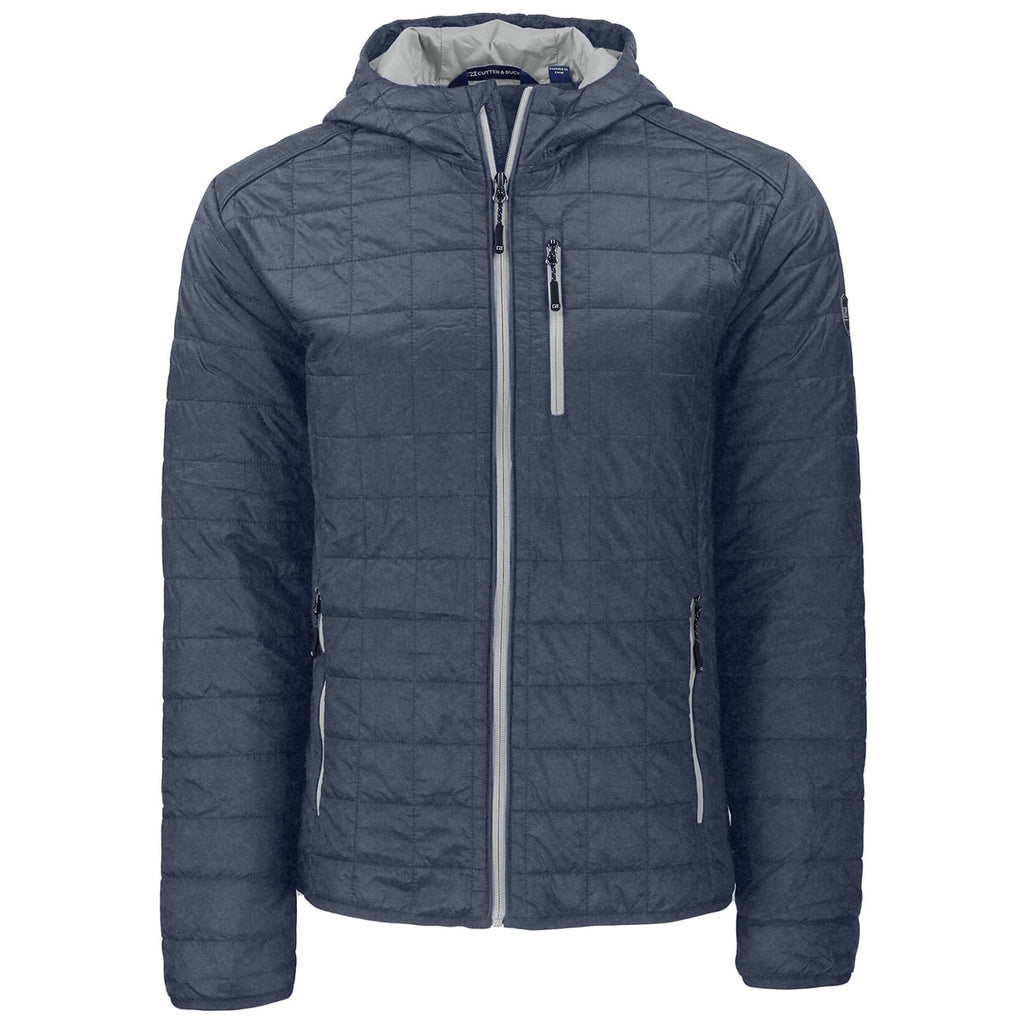 Cutter & Buck Men's Anthracite Melange Rainier Primaloft Eco Full Zip Hooded Jacket with a custom logo is a fun and functional way to stay warm and protected when the weather turns. The lightweight puffer is designed for skiing, hiking, golf, and other epic adventures. Place your order right away so you do not miss out.Corresponding Women's Style: Cutter & Buck Women's Anthracite Melange Rainier Jacket