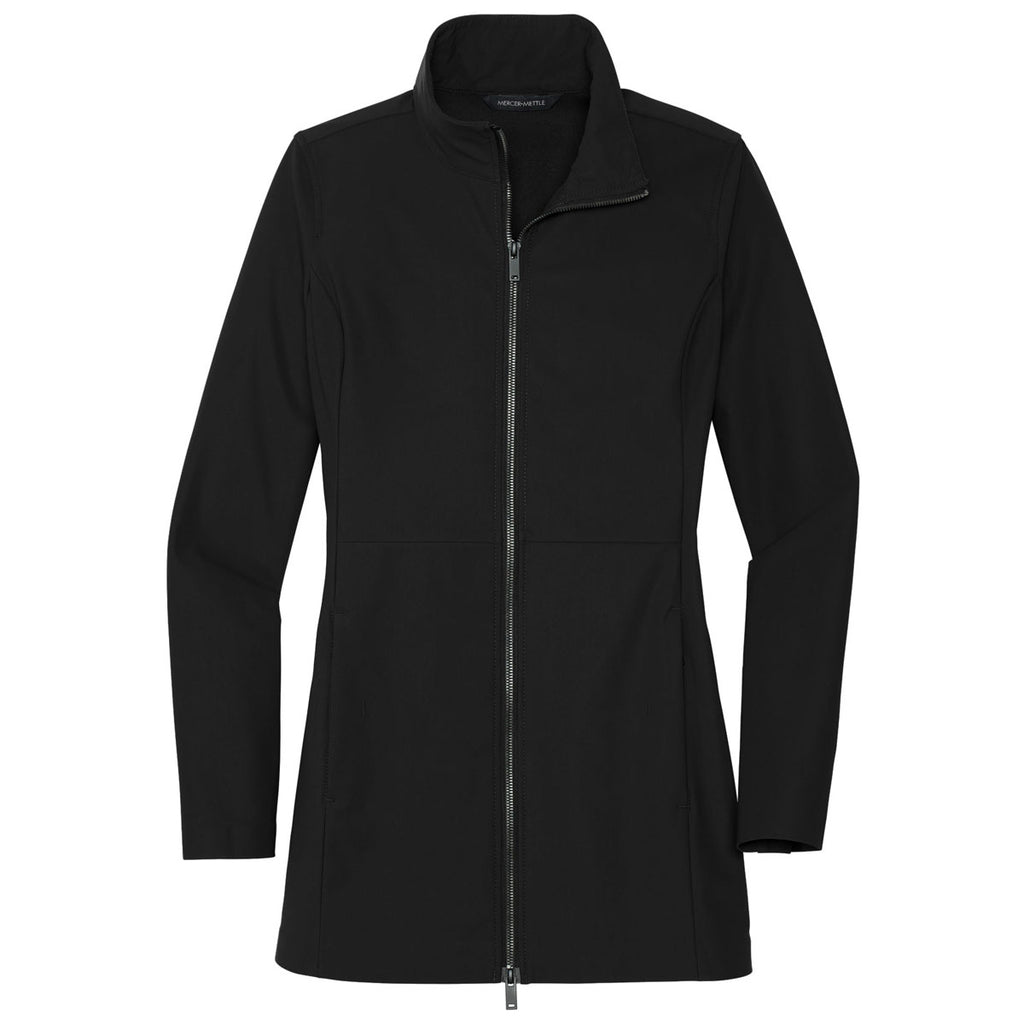Mercer+Mettle Women's Deep Black Faille Soft Shell with custom logo is a high-end look that can go from the corporate office to dinner with friends with ease. The slightly longer length offers added coverage on this waterproof, breathable soft shell that will be a welcome addition to any wardrobe. Place your order today.Corresponding Men's Style: Mercer+Mettle Men's Deep Black Faille Soft Shell