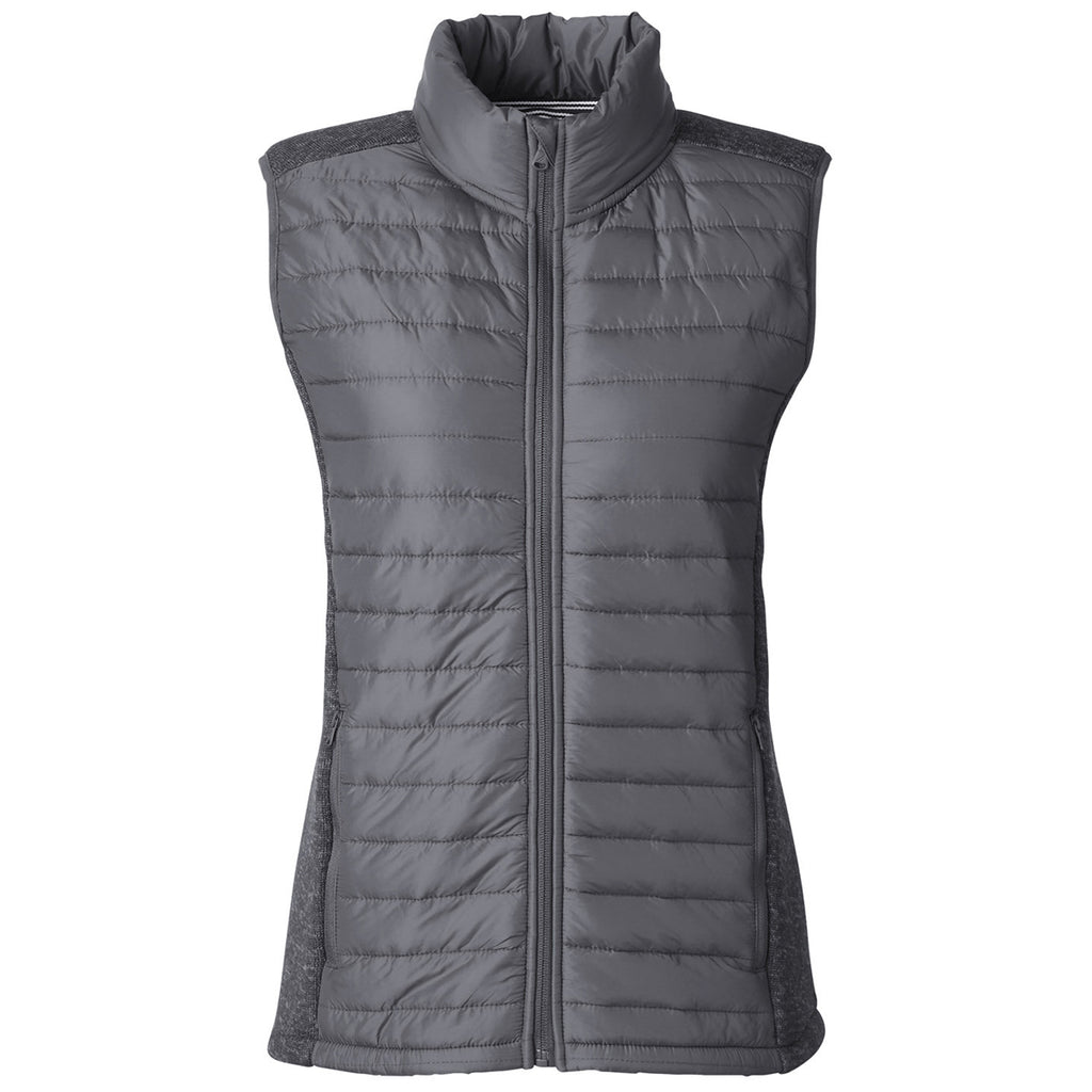 Choose embroidery for the Nautica Women's Graphite/Graphite Heather Harbor Puffer Vest to create an overall look that is ready for adventure. The puffer vest is fashion forward without being too bulky with heat-retaining properties and water-resistant qualities. Your corporate logo would turn this vest into an excellent employee gift or an addition to a logoed apparel line. Place an order today.