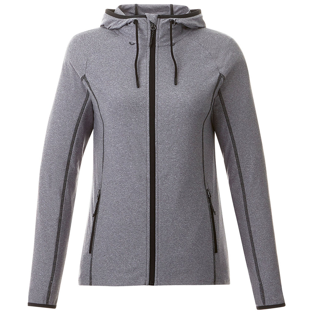 The custom logo Elevate Women's Medium Heather Grey Kaiser Knit Jacket offers a stylish outerwear option which can display your company logo for all to see. Four vibrant colors are available and you're going to find it hard to pick just one. Features of this comfortable knit jacket include a warm textured jersey knit fabric, shaped seams, tapered waist, attached drawstring hood, two outside zippered pockets and one interior pocket. Purchase a number of these lovely knit jackets and have an embroidery logo affixed to the outside. This makes the perfect employee apparel gift for the entire office.Corresponding Men's Style: Elevate Men's Medium Heather Grey Kaiser Knit Jacket