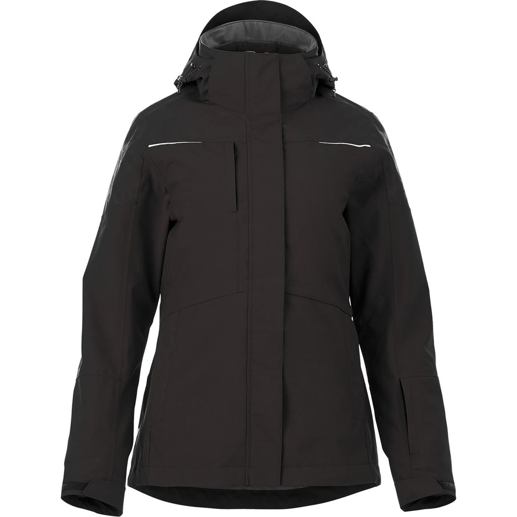 Elevate Women's Black Yamaska 3-IN-1 Jacket is the must have choice for cold weather. Enjoy a casual stroll in the fall or a day on the slopes with the 3-IN-1 style that includes a water repellant outer shell with reflective details. The detachable hood and an insulated inner jacket in a complementary color makes this jacket stand out in a crowd. A custom corporate embroidered logo can be added making this a great corporate gift at a reasonable price. Available in a variety of sizes to fit most, choose the color combination that will best display your custom design. Order today to offer as a corporate gift or up your employee apparel game to the highest level.Corresponding Men's Style: Elevate Men's Black Yamaska 3-IN-1 Jacket