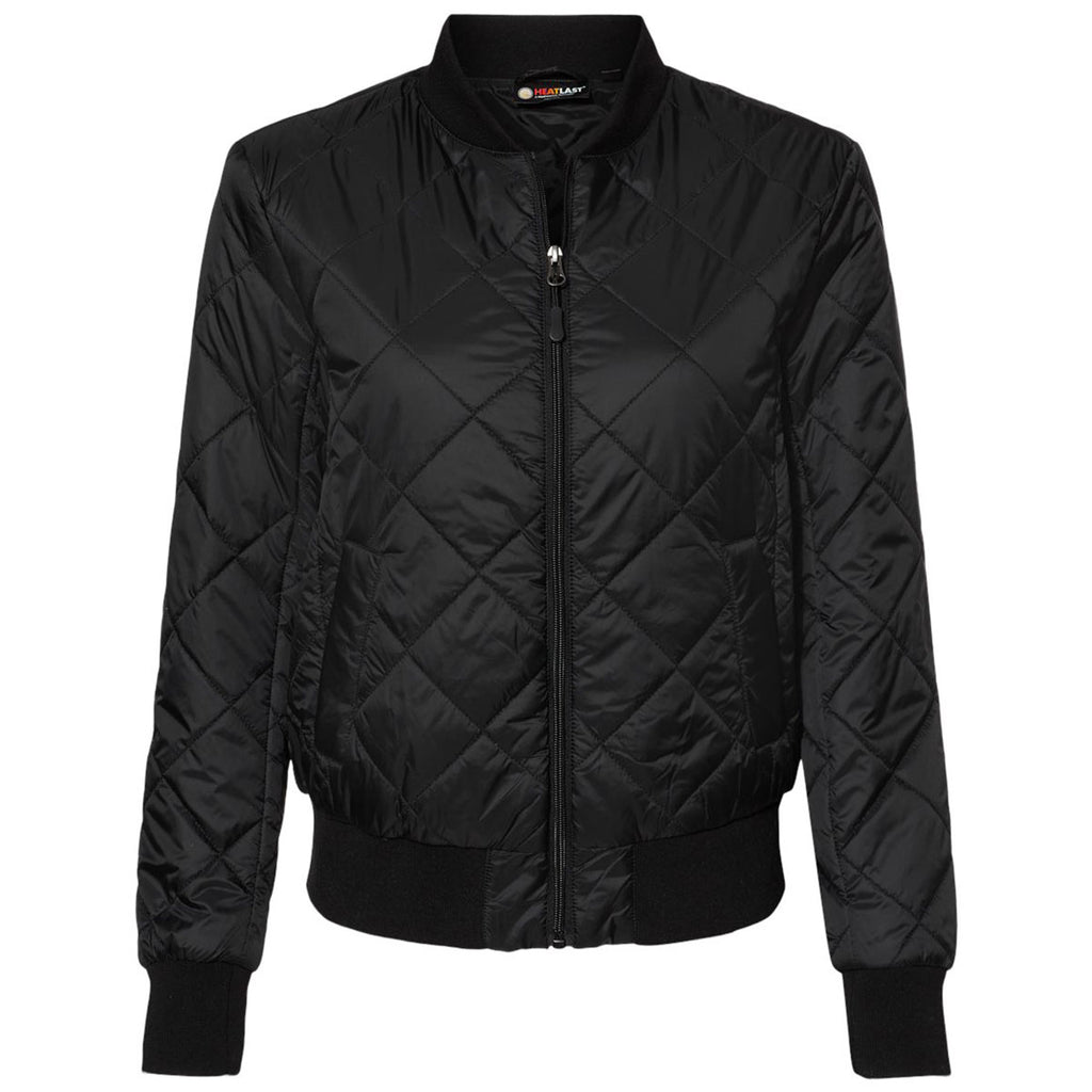 Design embroidery for the Weatherproof Women's Black Heat Last Quilted Packable Bomber for a creative look that also keeps you warm as you go about your day. The diamond quilted design has a coated nylon shell with polyester fill that is both wind and water resistant. A ribbed knit collar, cuffs, and waistband are a creative design that many will adore and recognize. Add a company logo to give as employee gifts to those who work their hardest. Open welt pockets keep your small items at hand as needed and when the weather warms, this bomber folds and stows into a separate pouch.Corresponding Men's Style:Weatherproof Men's Black Heat Last Quilted Packable Bomber