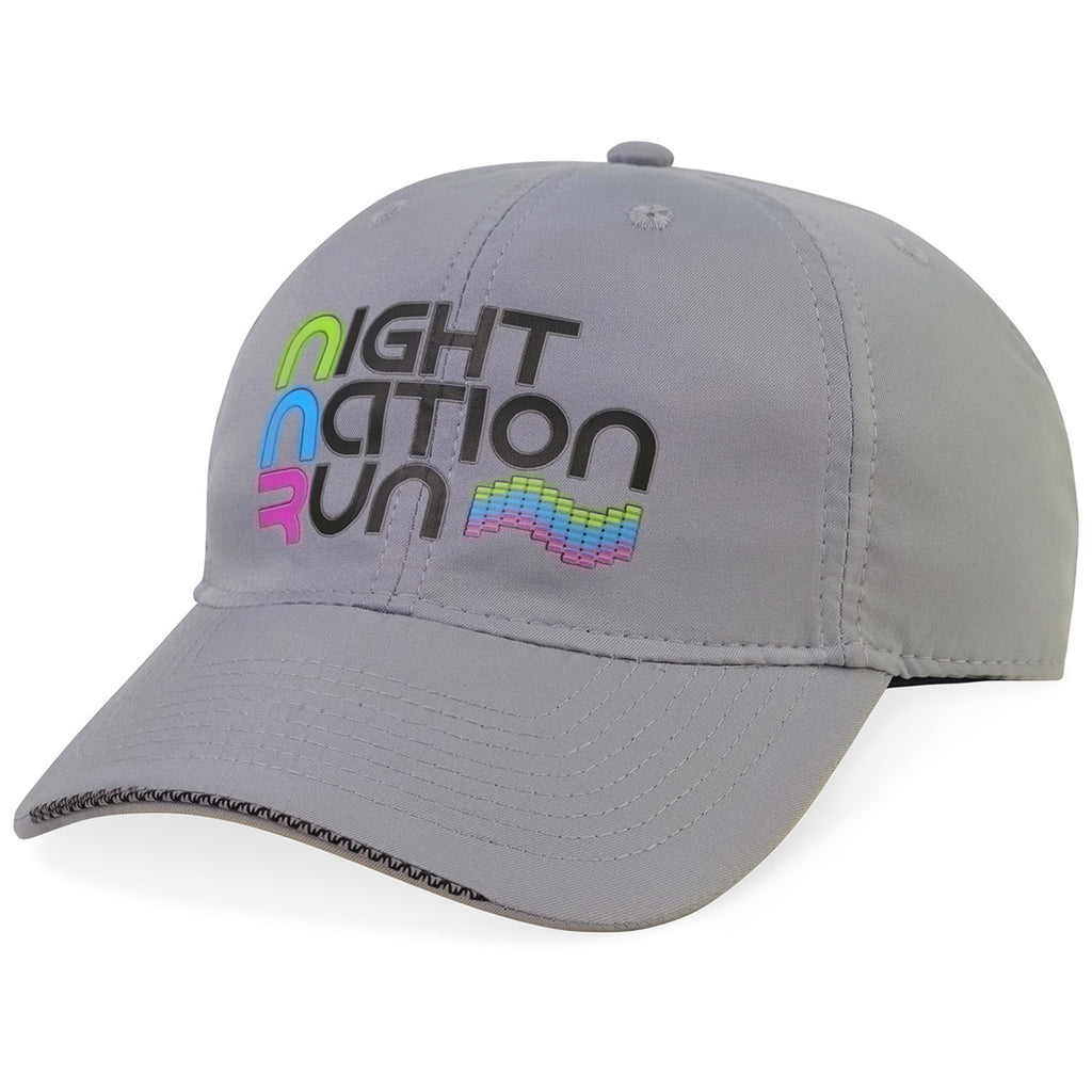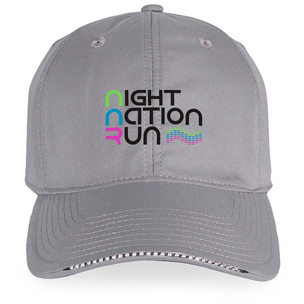 Design a colorful custom logo for the Merrimack Hat Co. Grey Neo Recycled Performance Cap. This cap is made of recycled materials for an eco-friendly version of a favorite design. The unisex cap has a UPF rating of 50 and reflective piping, making it perfect for outdoor adventures, sporting events, or just hanging out with friends.