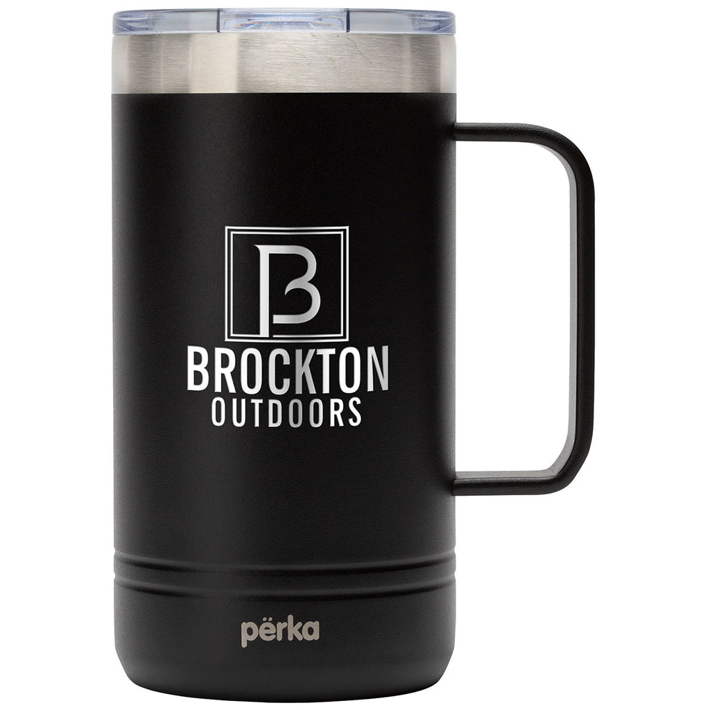 The Perka Wayfarer 24 oz. 304 Stainless Steel Mug is an eco-friendly promotional item that will look even better when it features your company or team's custom logo or design. A great employee apperception gift or new employee welcome gift, this mug features a powder coated exterior and a handle.