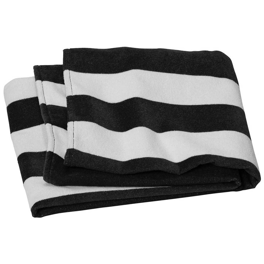 Hit the beach or lay out by the pool in a custom embroidered Port Authority Black Value Cabana Stripe Beach Towel. The bright stripes on this large 30 x 60 inch towel will stand out with your company logo embroidered in the perfect location. Made of 100% USA cotton terry velour, fully hemmed, and with fade resistant stripes this towel makes the perfect employee gift or end of the year gift for those you care for in life. Place an order for several to use at team events for those participating in swim meets or any outdoor activity as additional ground seating. The possibilities are endless for these useful towels.Highlights