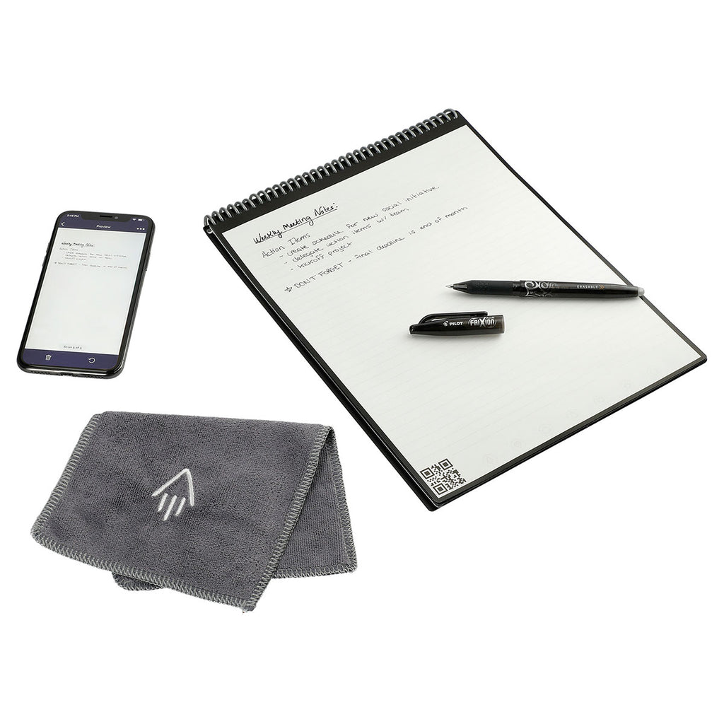 The RocketBook Letter Flip Notebook Set features a contemporary notepad that is a must-have item for any event giveaway or employee welcome package. Write on the synthetic lined paper using the Pilot Frixion pen. Then, wipe it away and start again. The all black cover will also showcase your company’s custom logo.