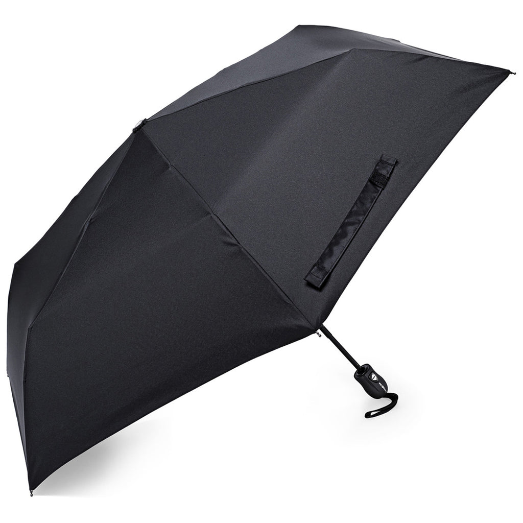 Create your custom design for the Samsonite Black Compact Auto Open/Close Umbrella to give as a gift, prize, or sell in your shop. The sleek black umbrella has three sections with a sleek matching steel shaft and slip-resistant round handle wrist strap. Perfect for the office, the vehicle, or to keep handy when the weather is questionable.