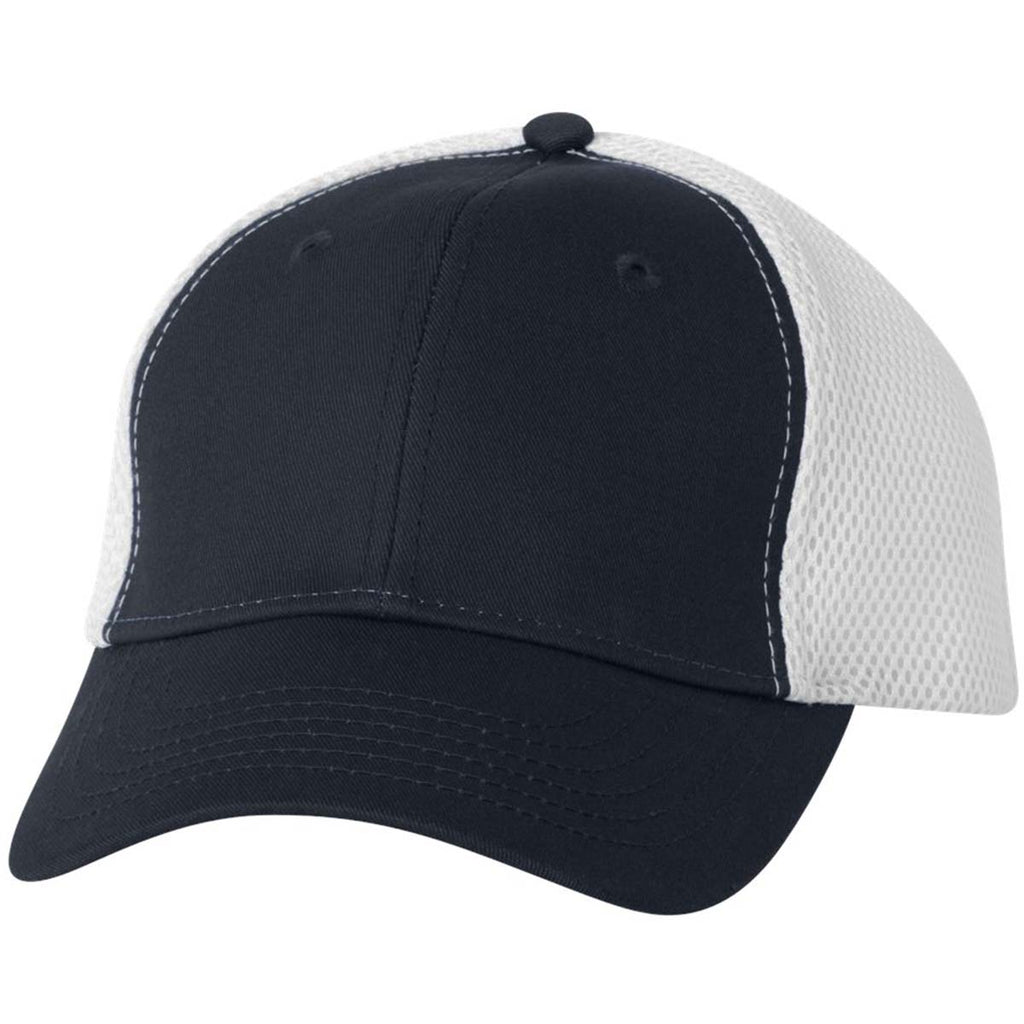 Enjoy your own unique custom look with the Sportsman Navy/White Spacer Mesh Cap in seven color combinations. These cotton, polyester front caps offer a foam mesh back for the ultimate in comfort. Add a corporate embroidery to the crown in the color and design of your choice and use these as part of employee apparel or as headwear gifts for nearly any occasion. The structured, six-panel, mid-profile look has a pre-curved visor with matching undervisor and sewn eyelets. Perfect for a sporting event or just enjoying a day, the hook and loop closure is easy to adjust.Highlights