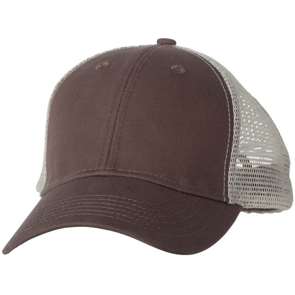 Create a custom classic with the Sportsman Brown/Khaki The Duke Washed Trucker Cap in a large variety of color combinations. Made of cotton and a polyester bio-washed chino twill front with 100% polyester mesh back, this trucker cap will be an instant favorite for most. The structured, six-panel, mid-profile fit has a pre-curved visor and sewn eyelets for the true trucker cap look. Add a custom embroidery to have custom headwear people will want or a company logo to use this as part of employee apparel. The hook and loop closure means adjusting the size of this cap is a breeze.Highlights