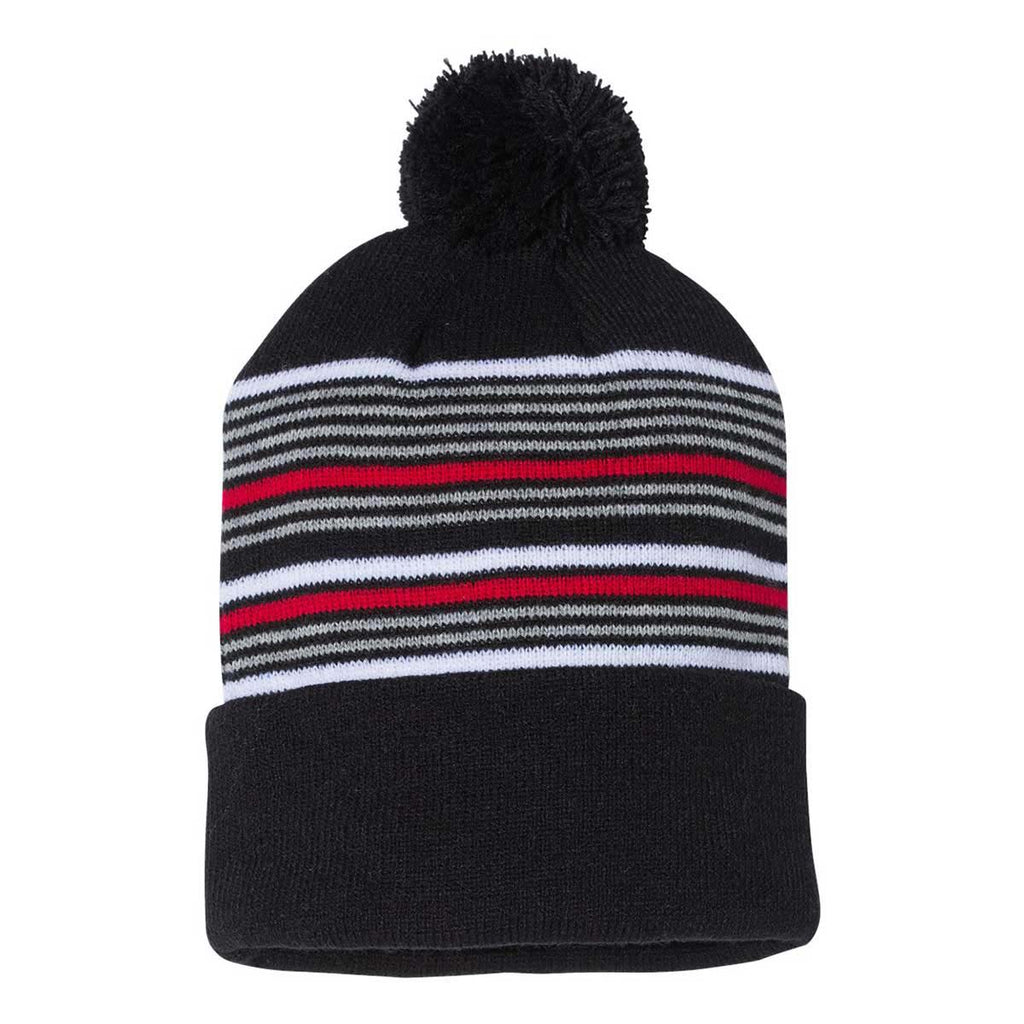 Sportsman Black/White/Grey/Red 12" Striped Pom-Pom Knit Cap