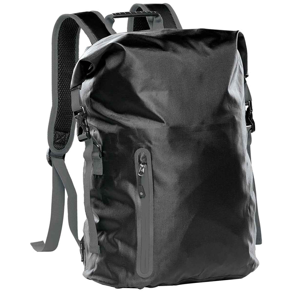Add embroidery to the Stormtech Black/Granite Panama Backpack for a creative look that can be enjoyed daily or on special trips. Built from hard-wearing, coated ripstop fabric, the Panama backpack can be decorated with your custom logo to give as a custom gift or to use as part of your logoed apparel line. This 100% waterproof backpack with sealed seams is as prepared for wet, cold weather, and mid-summer hikes in the mountain. A roll-up closure allows you to adjust the size of the backpack as needed, all the while sealing out whatever weather you happen to encounter. Adjustable, ergonomic shoulder and sternum straps allow you to enjoy a custom fit.Highlights