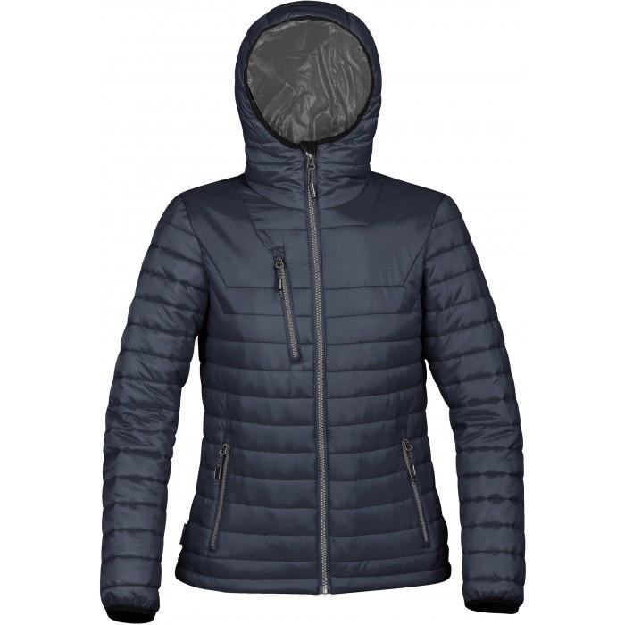The weather outside is awful-but that doesn't mean you have to feel that way. This Stormtech Women's Navy/Charcoal Gravity Thermal Jacket will have you feeling your best thanks to a water repellant outer shell and lightweight, warm construction. With your company's logo on this jacket, you can fashion it into a great prize or corporate giveaway.