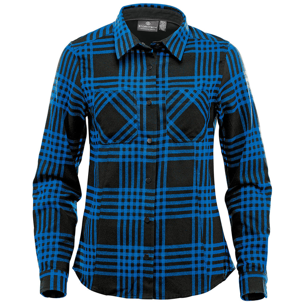 Embroidery will pop on the Stormtech Women's Blue/ Black Santa Fe Long Sleeve Shirt. The vibrant color palette chosen for this shirt is an updated take on the traditional plaid shirt. The unforced finish is an urban outdoor staple whether making a weekly trip to the farmer's market or heading out with friends for an early morning hike. Add a custom logo to give as gifts or a company logo to use as part of employee apparel. A truly cultured look with snap closures along the front and snap closure pockets, this urban essential is a must have.Corresponding Men's Style:Stormtech Men's Blue/ Black Santa Fe Long Sleeve Shirt