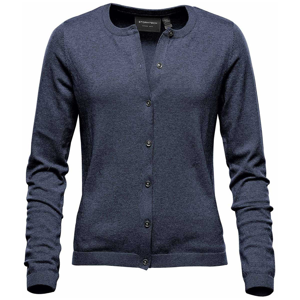 A custom Stormtech Women's Navy Avondale Cardigan will make you feel at home no matter where you go. The comfortable familiarity of this cardigan can carry your embroidery with style in the design you create. A full button front provides a conservative look that can be punched up with the right garment underneath. A rib crew neck, cuffs, and hem add to the warmth and feel of this piece. Add a company logo to use as employee apparel in cold weather or general uniform pieces as needed.Highlights