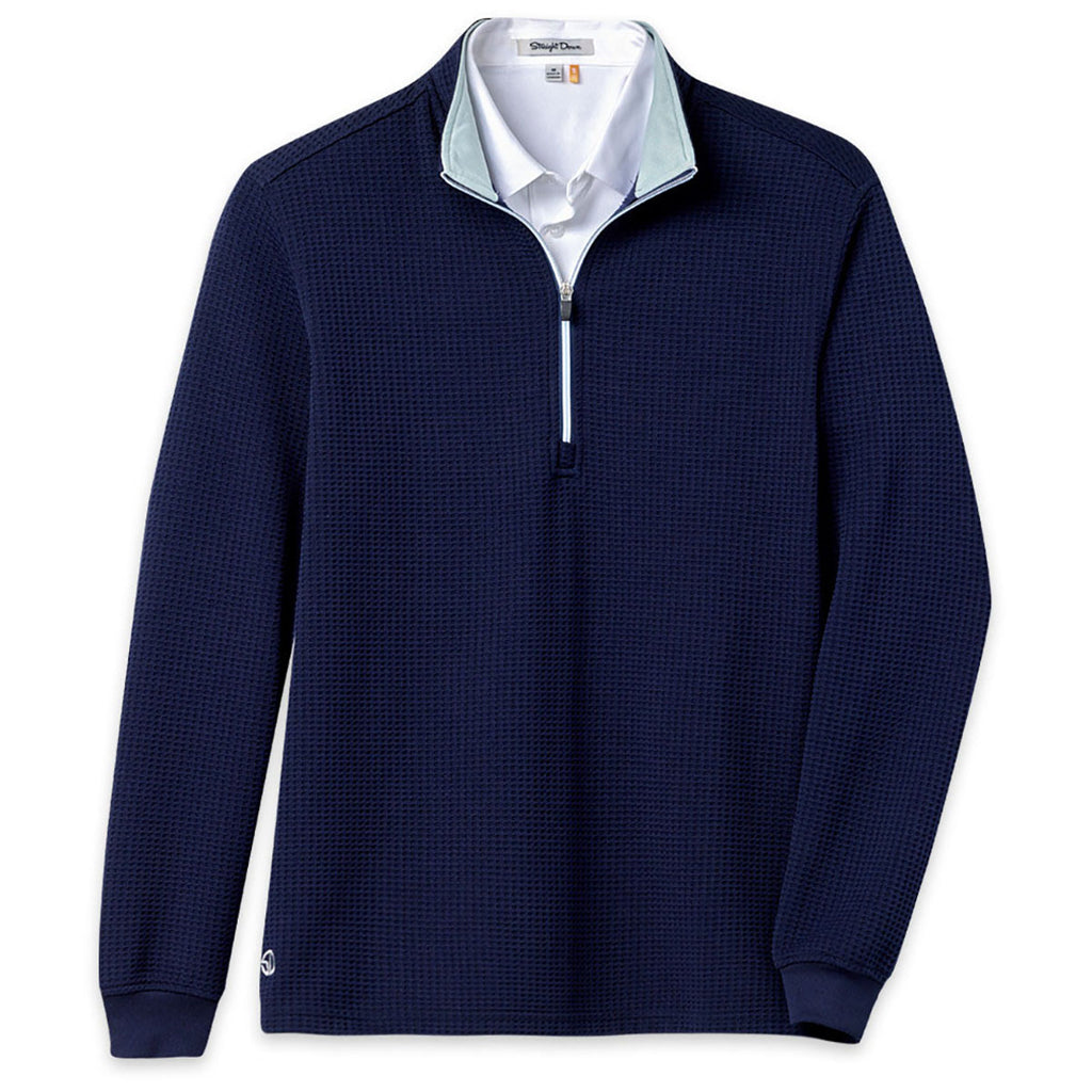 Designed for corporate branding or upscale casual wear, the Straight Down Men's Indigo Optic Quarter Zip stands out with its textured jacquard pattern. The breathable fabric stretches for comfort while providing a tailored look. Easy to layer over polos or tees, it's a go-to piece for team events or travel.Highlights