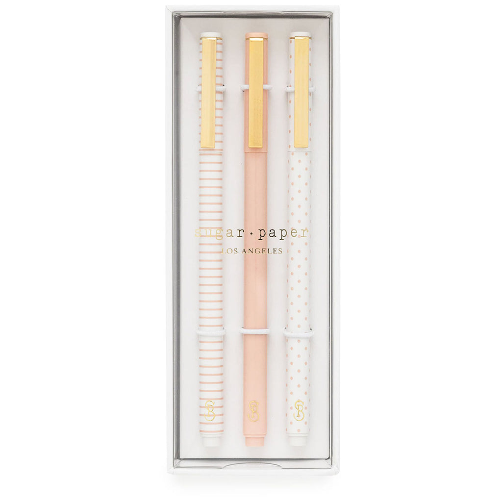 A stylish pink color palette makes the Sugar Paper The Rose Pattern Pen Set (Set of 3) a must-have for any elegant office space. Sleek black ink and a smooth barrel design makes them a dream to write with. Add your company's custom logo or design to create an unforgettable branded gift or giveaway item.The minimum is 3 units.