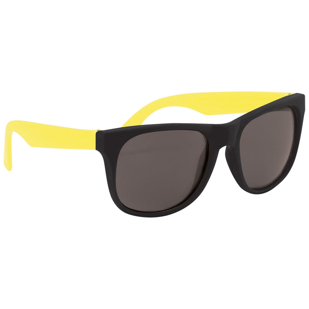 Add your custom name or design to the Hit Yellow Rubberized Sunglasses to keep people protected and your brand prominent. The multiple colorful options will be a Hit for vacation, travel, and general use. Great for seasonal shops, vacation rentals, gifts, or prizes for special events. The rubberized glasses are tough for long term wear.