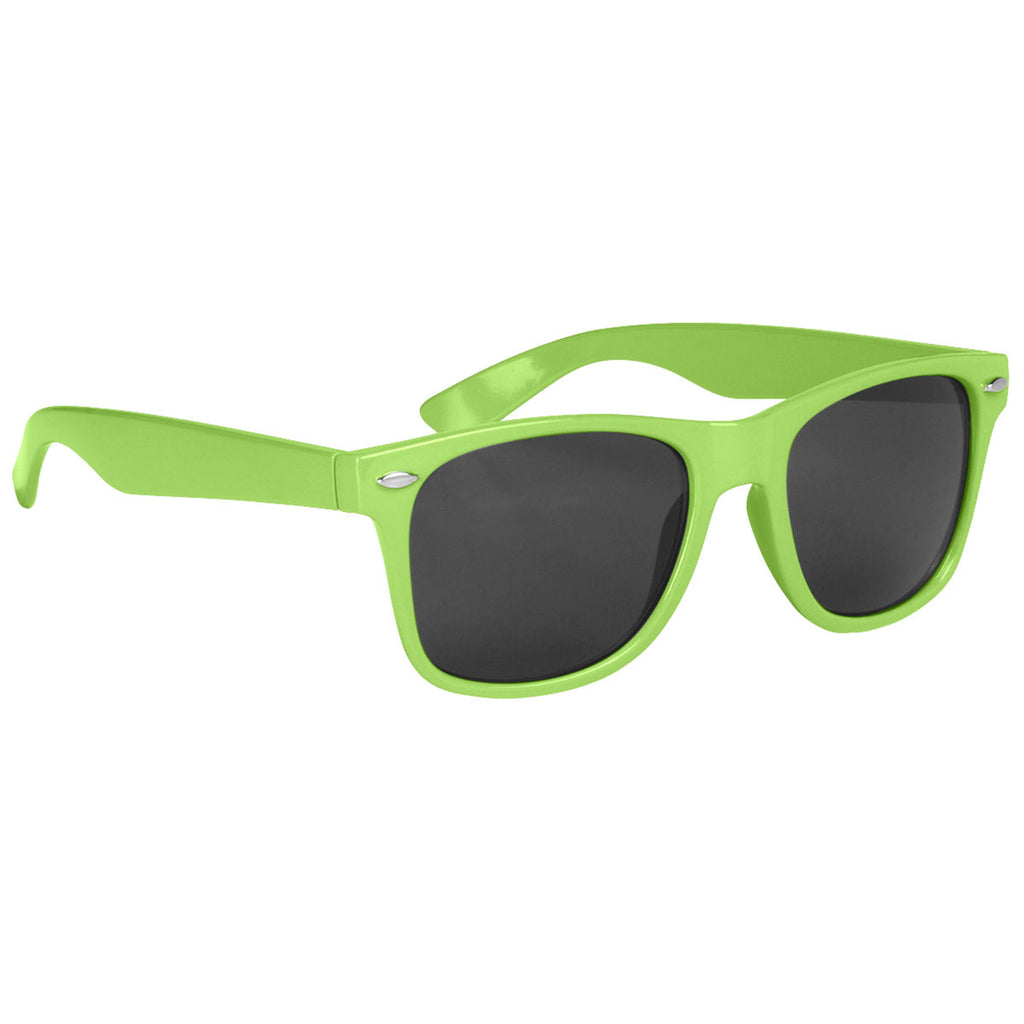 Stay cool in custom Hit Lime Green Malibu Sunglasses. These sunglasses come in multiple colors, some of which are made of recycled materials. The UV400 lenses provide 100% UVA and UVB protection so you can enjoy a day at the beach, a sunny morning jog, or a long drive in the car with ease. A perfect addition to many shops.