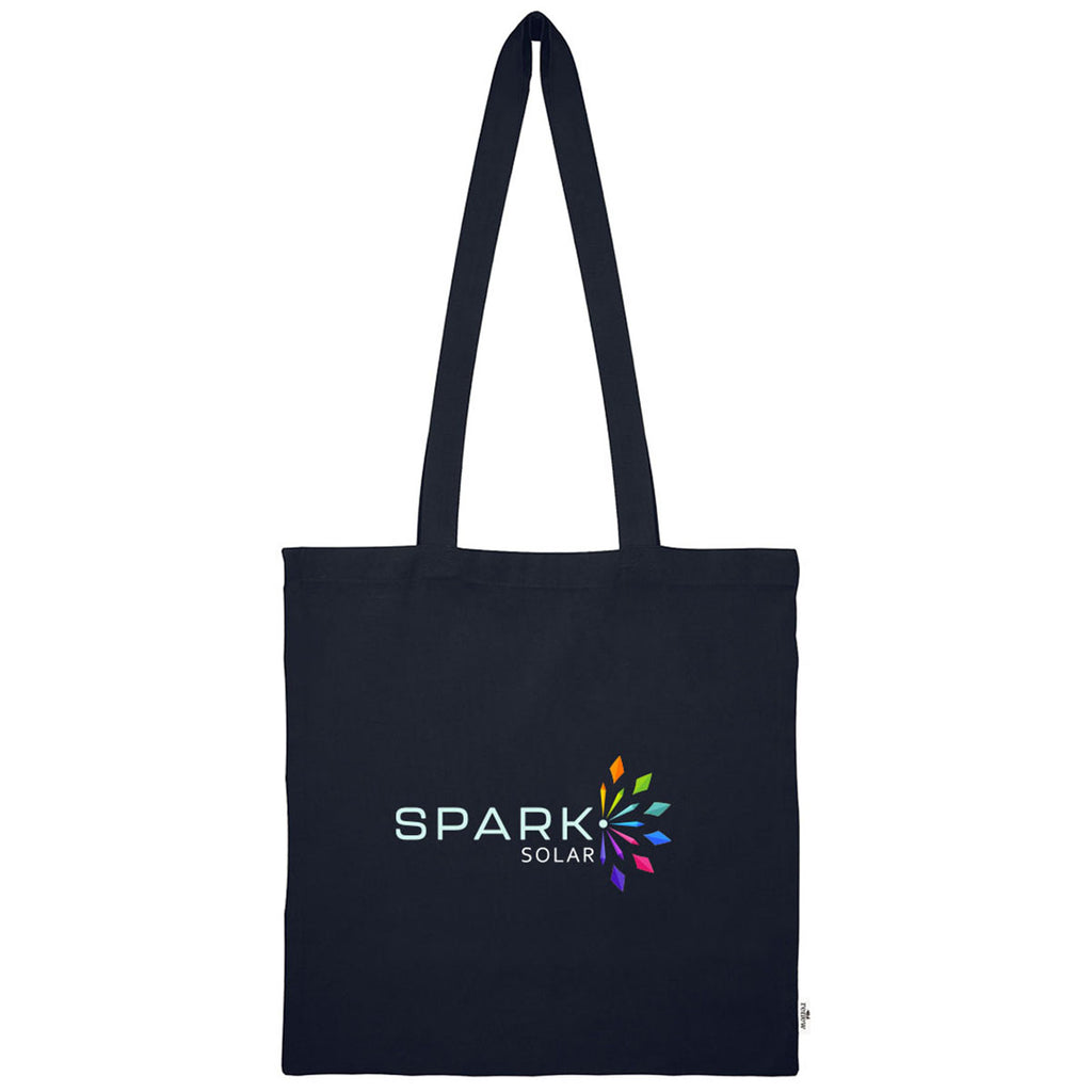 Go green with the custom Hit Navy Jones Recycled Cotton Tote Bag. Made from eco-friendly materials, this sturdy tote is perfect for daily errands, shopping, or events. Its spacious design and reinforced handles offer durability and convenience. Ideal for businesses looking to promote sustainability, this bag keeps your brand in hand while reducing environmental impact.The minimum order for this product is 150 pieces.