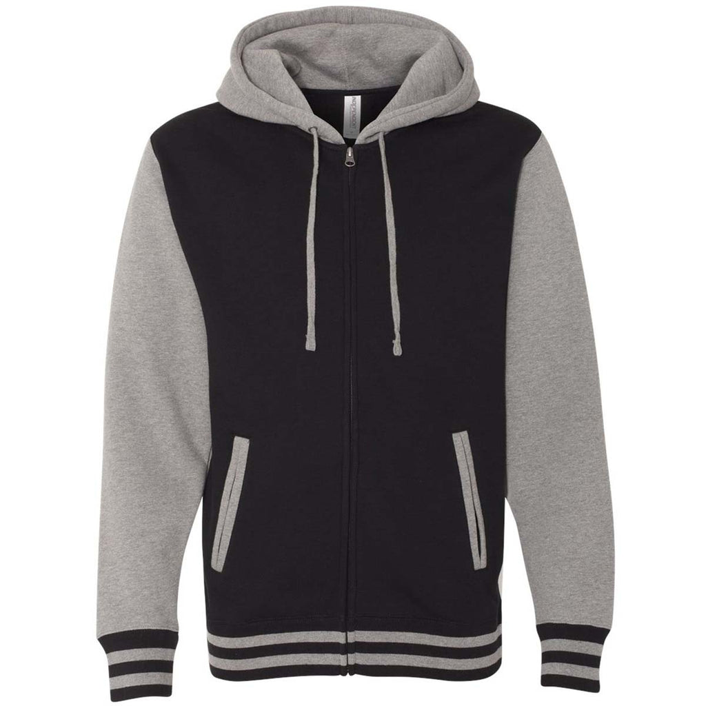 Be head of the class with a corporate embroidered Independent Trading Co. Unisex Black/Gunmetal Heather Varsity Hooded Full-Zip Sweatshirt in six color combinations. The cotton polyester blend 3-end fleece offers a unique, yet comfortable look that will have you reminiscing about the good old days in no time. Perfect for a youthful look with a company logo being used as employee apparel or just to customize and use as employee gifts. The slim unisex fit is both fashionable and functional in this varsity creation. The signature stripping around the cuff and hem and coordinating color hood add to the overall look.Highlights
