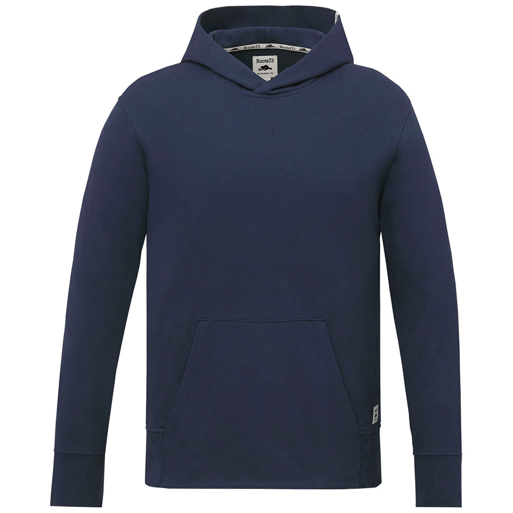 Roots73 Unisex Indigo Blue Canmore Eco Hoodie with custom embroidery is stylish, comfortable, and eco-friendly. Featuring dropped shoulders, a hood, and a kangaroo pocket, this hoodie is ready for a hard day's work or a relaxing day with friends. Great as company gear or to build your own brand. Place an order today.Highlights
