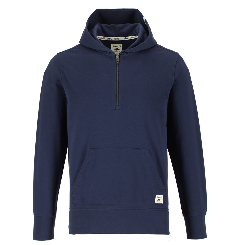 Roots73 Unisex Indigo Blue Canmore Eco Quarter Zip Hoodie with embroidery is a simple and fun way to create uniforms, gifts, or workout gear with ease. Ideal for personal trainers or athletes, this is a true must-have. The attached hood and quarter-zip style make this easy to layer, no matter the weather. Place an order today.Highlights