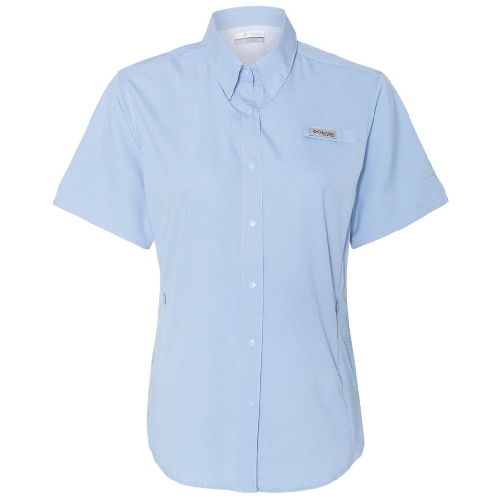 Create a corporate logo for the Columbia Women's Sail PFG Tamiami Short Sleeve Shirt to enjoy a classically styled form of workwear or a shirt to share with those who love your company and brand. The polyester ripstop material is durable and comfortable with UPF 40 sun protection, moisture wicking, and zippered hand pockets. Made for outdoor adventures like fishing, this is a true must-have.This product cannot ship outside of the United States.