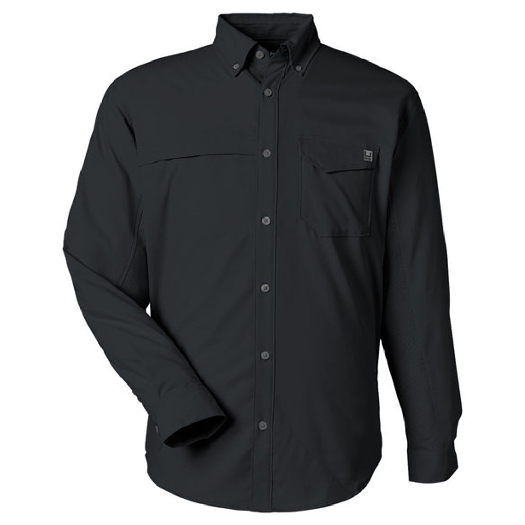 Design a corporate logo for the HUK Men's Black Tide Point Long Sleeve Shirt for a professional look that can be worn alone or with a jacket to create an overall style. The button-up style creates a perfect uniform or all around shirt that can go from the office to a night out with friends with ease.Corresponding Women's Style: HUK Women's Black Tide Point Long Sleeve Shirt