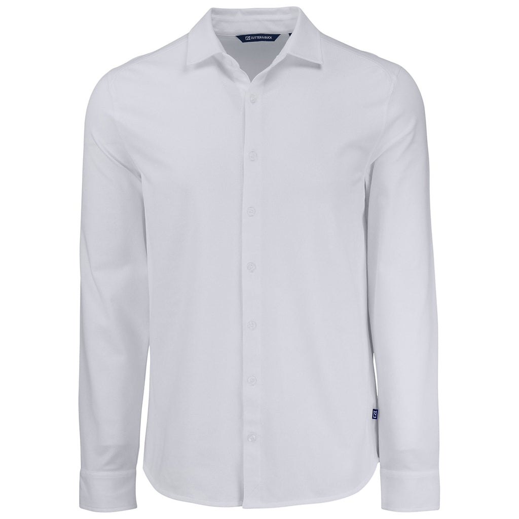 Design a corporate logo for the Cutter & Buck Men's White Advantage Tri-Blend Eco Soft Pique Long Sleeve Knitted Button Down. The stretch pique fabric offers sun protection, moisture wicking, and a self-fabric collar, all made from sustainable materials. Great for work, errands, or chilling at home while looking great.Corresponding Women's Style: Cutter & Buck Women's White Advantage Tri-Blend Eco Soft Pique Long Sleeve Knitted Button Down