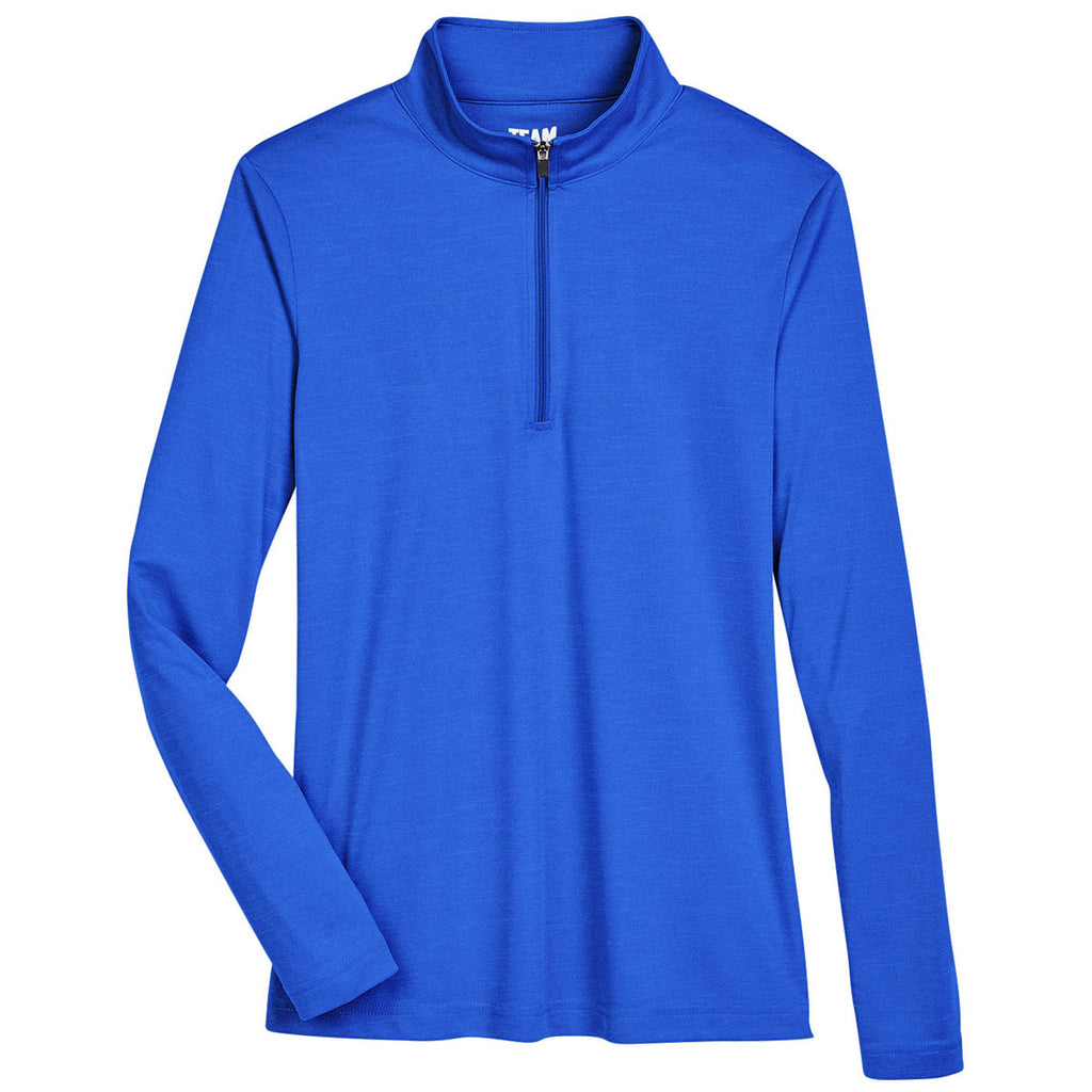 Combining sophistication with style, Team 365 Women's Sport Royal Heather Zone Sonic Heather Performance Quarter-Zip is the stuff of dreams when it comes to branded custom logoed apparel. Ready to be finished with an embroidered logo of your brand, the quarter-zip uses cationic dyes to ensure superior visibility in the dark. Features a semi-auto lock slider and rubber head for smooth movement of the zipper. Its moisture-wicking ability and lightweight fabric ensure your team stays dry and comfortable. Plus, it's shielded with UV protection, too. Don't miss out on this Full-Sleeve Quarter-Zip if you're after a versatile promo item for your company women's workforce.Corresponding Men's Style:Team 365 Men's Sport Royal Heather Zone Sonic Heather Performance Quarter-Zip