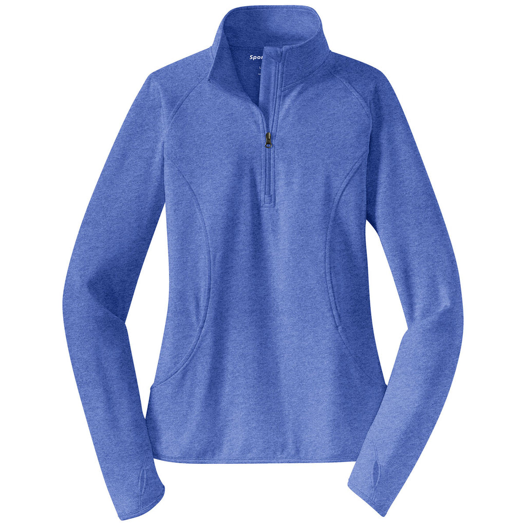 Since when did they start making a 1/4-zip pullover that's as feminine as it is comfortable? Since the Sport-Tek Women's True Royal Heather Sport-Wick Stretch 1/4-Zip Pullover hit the market. The flexible outer layer is stretchy and comfortable without ever leaving you feeling underdressed. The tag-free label ensures that you can wear the cadet collar all day. But what might be most striking about this piece is the gently contoured silhouette. This is a pullover designed not just for active women, but for any woman who appreciates a good fit and a comfortable piece for almost any cool season. Add your corporate embroidery to the front for an extra bit of customized flair.Corresponding Men's Style: Sport-Tek Men's True Royal Sport-Wick Stretch 1/4-Zip Pullover