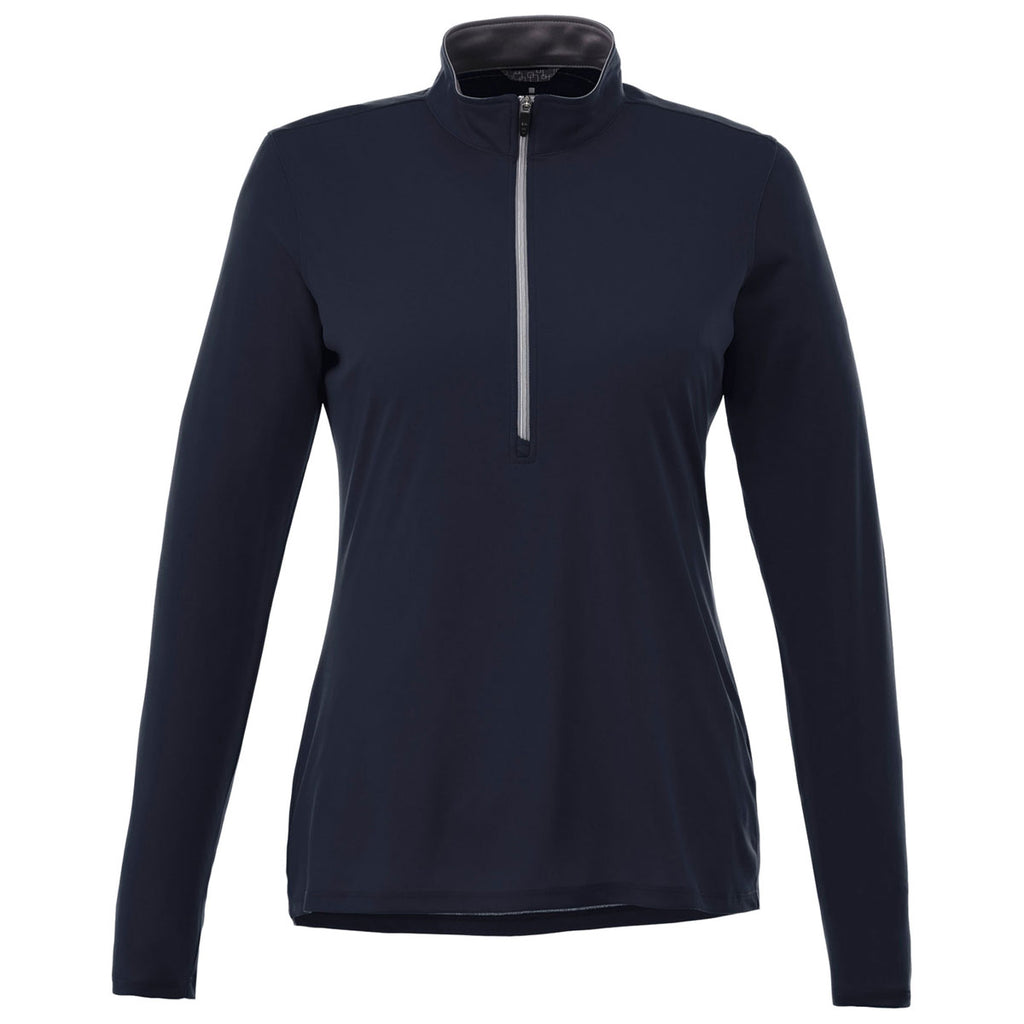 The Elevate Women's Navy Vega Tech Half Zip with your custom logo is a perfect gift for your loyal female employees. It has a stylish professional look and it features a lightweight breathable but moisture wicking fabric. This fabric has UV protection and resists snagging so it is ideal for sunny days. This piece of wardrobe is designed for wash-and-wear convenience and therefore makes a perfect gift for every modern woman. Because of its versatile look, your employees will gladly wear it not only for corporate events but during their everyday activities. Let your employees know they are appreciated with this half zip.Corresponding Men's Style:Elevate Men's Navy Vega Tech Quarter Zip