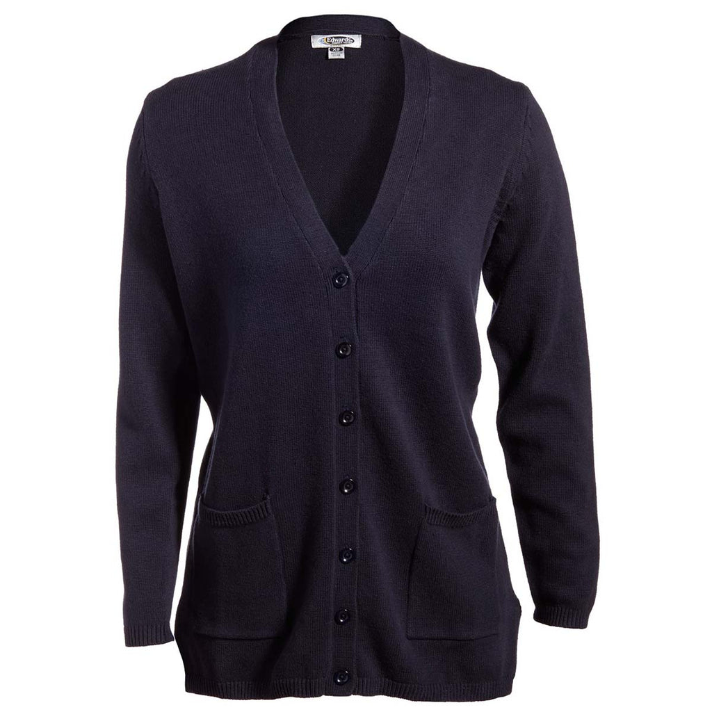 Create a custom look that will be envied with the Edwards Women's Navy V-Neck Long Cardigan. Made of a cotton rich, acrylic, and nylon blend in a lightweight long cardigan style. The dyed to match buttons and smooth finish with tubular cuffs, side vents, and traditional V-neck creates a look that works as employee apparel or as part of hospitality apparel for those who interact with customers daily. Your corporate embroidery will stand out on the flattering silhouette that can be used at home or the office with ease.Highlights