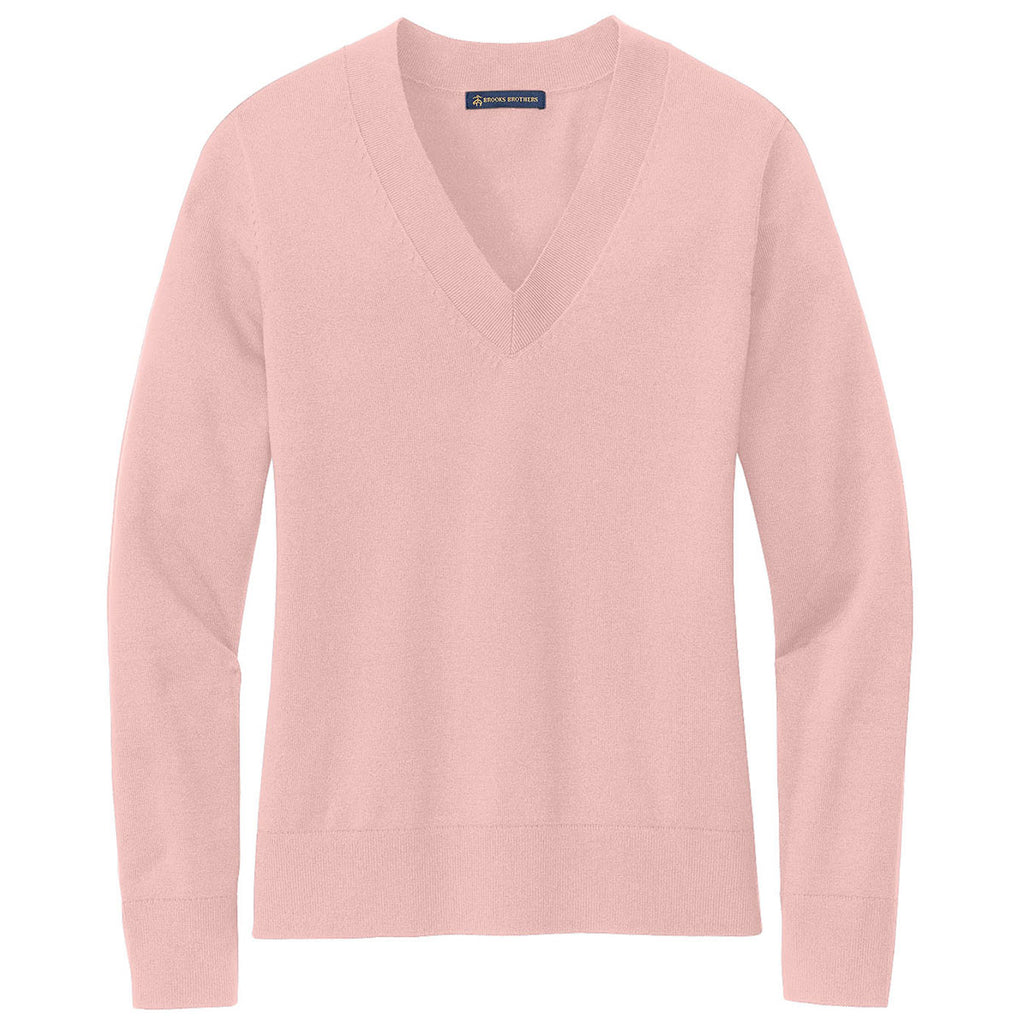 Order the Brooks Brothers Women's Pearl Pink Cotton Stretch V-Neck Sweater with custom embroidery for a classical crisp corporate piece. Stand out at any tradeshow and at the office in this high-quality sweater. Style and layer to add a personal touch to create multiple different outfits. Reach out and snag this multi-purpose piece.