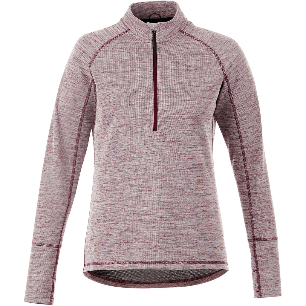 Elevate Women's Maroon Heather Crane Knit Half Zip is form fitting and fashionable in four fashion forward colors. The moisture wicking finish makes this the perfect half zip for a short run even in cold weather. Add a corporate or custom logo on to advertise while you exercise. Sleeve cuffs with thumb exits mean you can easily keep your hands toasty while taking a business call on the move. Offer as employee apparel to keep workers active or use personally as corporate apparel that is semi-formal, yet sleek in appearance. What are you waiting for? This decorated apparel is perfect to meet your needs.