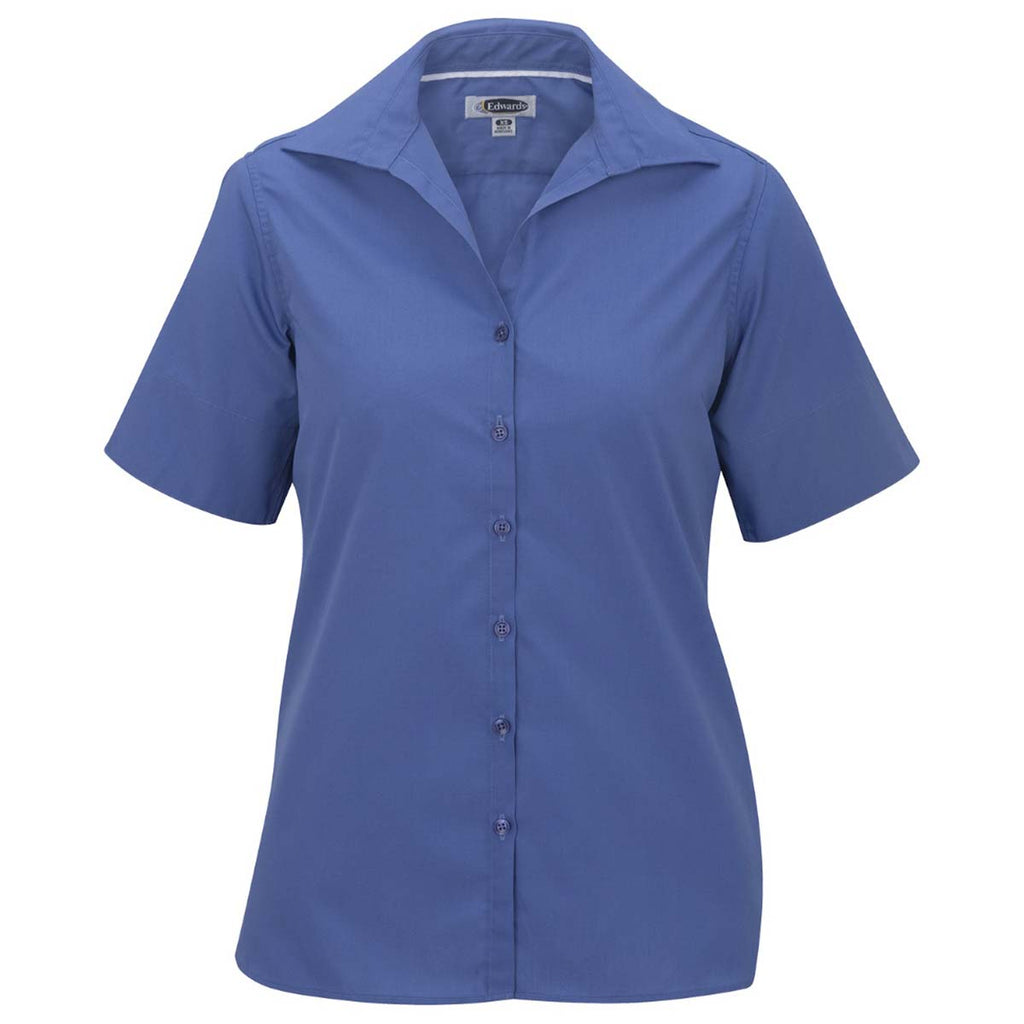 A custom dress shirt look with a comfortable feel comes together with the Edwards Women's French Blue Lightweight Short Sleeve Poplin Blouse. Made to stand up to the demanding wear of customer service or restaurants, these make great employee apparel for those that work the hardest. Add a custom logo and choose the color you like best as hospitality apparel. Made of polyester and cotton, this short sleeve shirt with matching buttons, countered seams, and open neck this shirt can easily go from the office to the sales floor and anywhere in between. Choose the color and embroidery you like best and place an order.Highlights