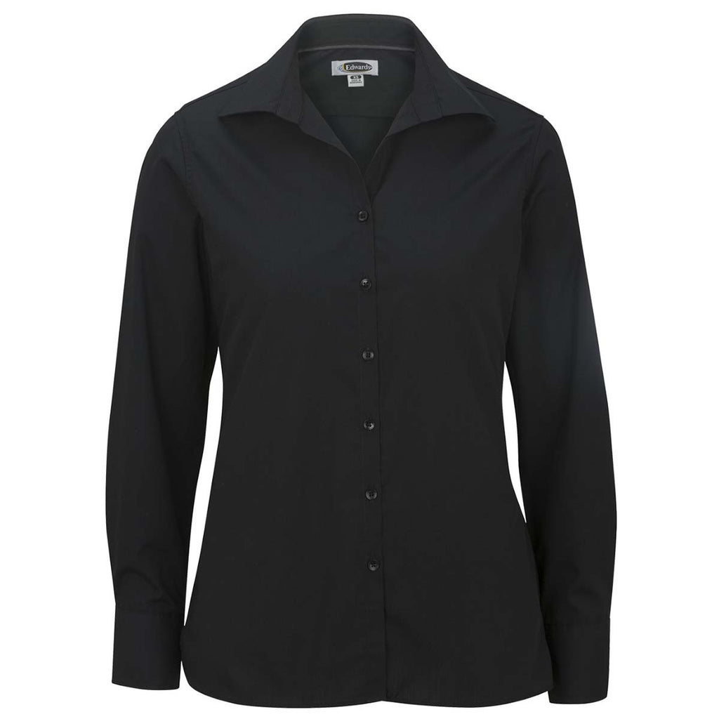 A custom dress shirt look with a comfortable feel comes together with the Edwards Women's Black Lightweight Open Neck Poplin Blouse. Made to stand up to the demanding wear of customer service or restaurants, these make great employee apparel for those that work the hardest. Add a custom logo and choose the color you like best as hospitality apparel. Made of polyester and cotton, this long sleeve shirt with matching buttons, countered seams, and open neck this shirt can easily go from the office to the sales floor and anywhere in between. Choose the color and embroidery you like best and place an order.Highlights
