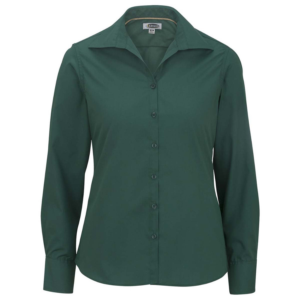 A custom dress shirt look with a comfortable feel comes together with the Edwards Women's Hunter Lightweight Open Neck Poplin Blouse. Made to stand up to the demanding wear of customer service or restaurants, these make great employee apparel for those that work the hardest. Add a custom logo and choose the color you like best as hospitality apparel. Made of polyester and cotton, this long sleeve shirt with matching buttons, countered seams, and open neck this shirt can easily go from the office to the sales floor and anywhere in between. Choose the color and embroidery you like best and place an order.Highlights