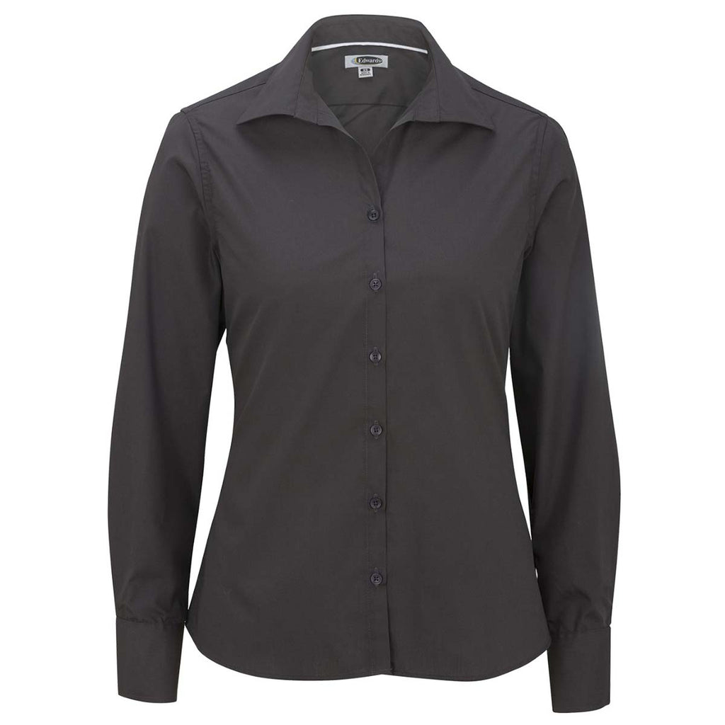 A custom dress shirt look with a comfortable feel comes together with the Edwards Women's Steel Grey Lightweight Open Neck Poplin Blouse. Made to stand up to the demanding wear of customer service or restaurants, these make great employee apparel for those that work the hardest. Add a custom logo and choose the color you like best as hospitality apparel. Made of polyester and cotton, this long sleeve shirt with matching buttons, countered seams, and open neck this shirt can easily go from the office to the sales floor and anywhere in between. Choose the color and embroidery you like best and place an order.Highlights