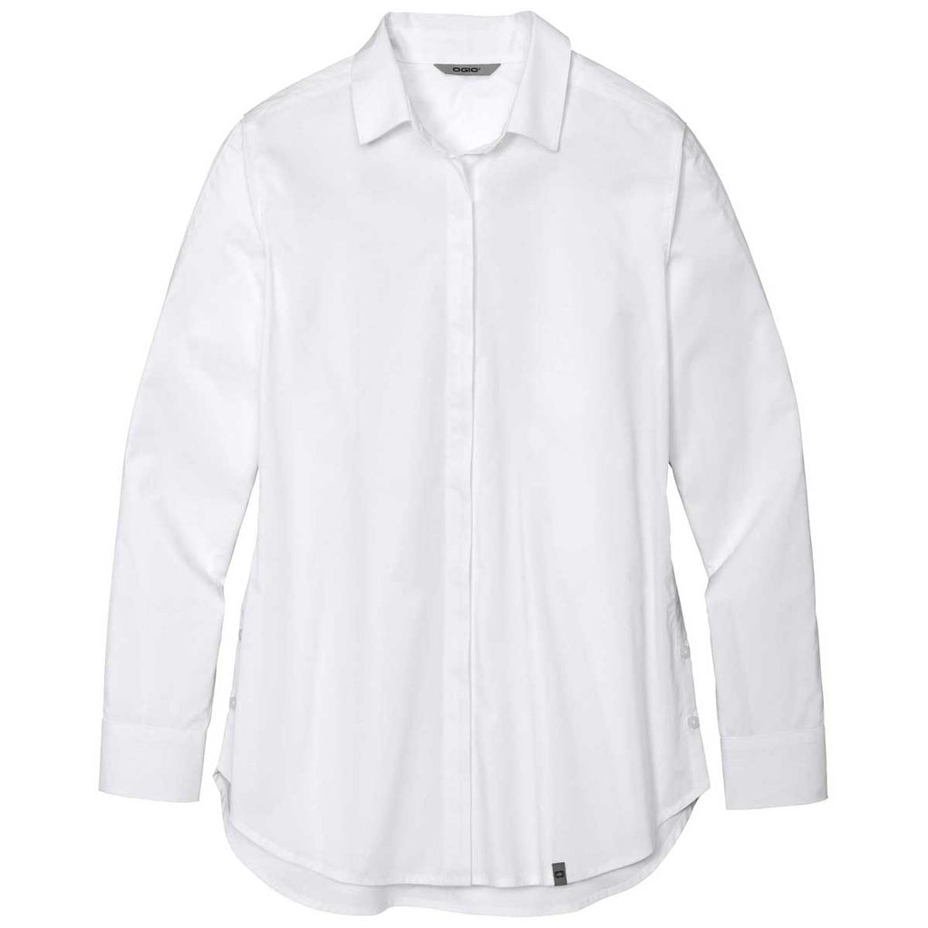 Embroidery will stand out on the OGIO Women's White Commuter Woven Tunic made of a lightweight cotton, poly, spandex blend that will stay comfortable throughout all your daily activities. This is a go-to tunic made for mobility and stretch that still maintains OGIO aesthetic. Add your company logo to create appealing employee wear that can be enjoyed while at work and easily cleaned for repeat use. The pull over tunic length top has a two button center placket for a bit of detail and a rounded shirttail hem. Side vents mean that movement is not impaired whether commuting to work or hanging out with friends.