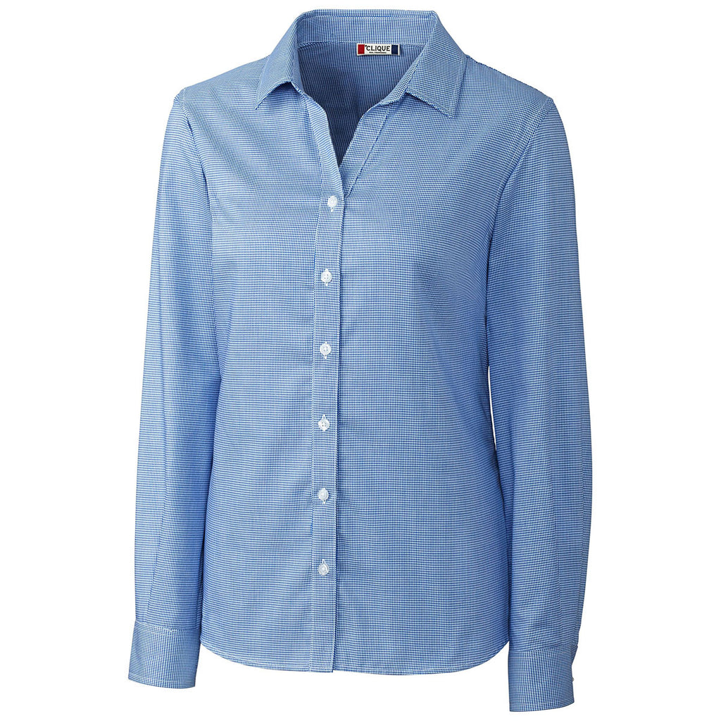 The Clique Women's Royal Blue/White Long Sleeve Granna Stain Resistant Houndstooth shirt offers a professional custom logo shirt option that can be worn almost anywhere. With your company logo added to the front, this long-sleeve shirt makes the perfect employee apparel item for casual Fridays at the office. Choose from a variety of eye-catching color schemes and select the one that accommodates your logo perfectly. Welcome features of this shirt include a 60% cotton twill/40% polyester blend fabric, spread collar, Y neck, French darts, buttoned cuff, and curved hem.Corresponding Men's Style:Clique Men's Royal Blue/White Long Sleeve Granna Stain Resistant Houndstooth Shirt