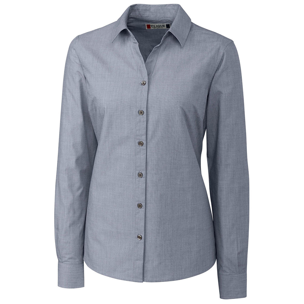 The Clique Women's Navy Blue Halden Stain Resistant Long Sleeve shirt is the ideal top to wear to the office or pair with some jeans for weekend casual wear. Add a custom logo to the shirt and advertise your company name for all to see. Choose from a variety of classic colors to select a color tone that works best with your corporate logo. Features of this shirt include a 60% cotton/40% polyester blend material, spread collar, Y neck, French darts, texture weave, and button-down front and cuffs. Purchase this shirt to hand out as employee apparel to your loyal and hardworking team members.Corresponding Men's Style:Clique Men's Navy Blue Halden Stain Resistant Long Sleeve
