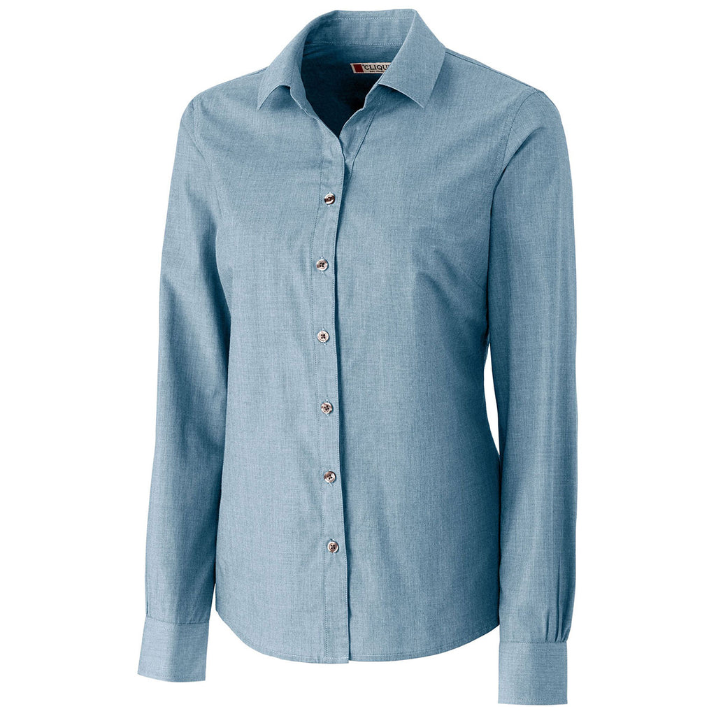 The Clique Women's Royal Blue Halden Stain Resistant Long Sleeve shirt is the ideal top to wear to the office or pair with some jeans for weekend casual wear. Add a custom logo to the shirt and advertise your company name for all to see. Choose from a variety of classic colors to select a color tone that works best with your corporate logo. Features of this shirt include a 60% cotton/40% polyester blend material, spread collar, Y neck, French darts, texture weave, and button-down front and cuffs. Purchase this shirt to hand out as employee apparel to your loyal and hardworking team members.Corresponding Men's Style:Clique Men's Royal Blue Halden Stain Resistant Long Sleeve