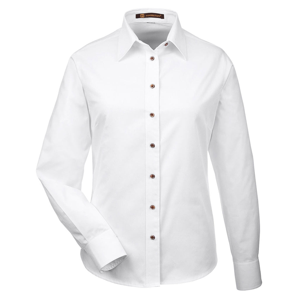 Harriton Women's White Easy Blend Long-Sleeve Twill Shirt with Stain-Release