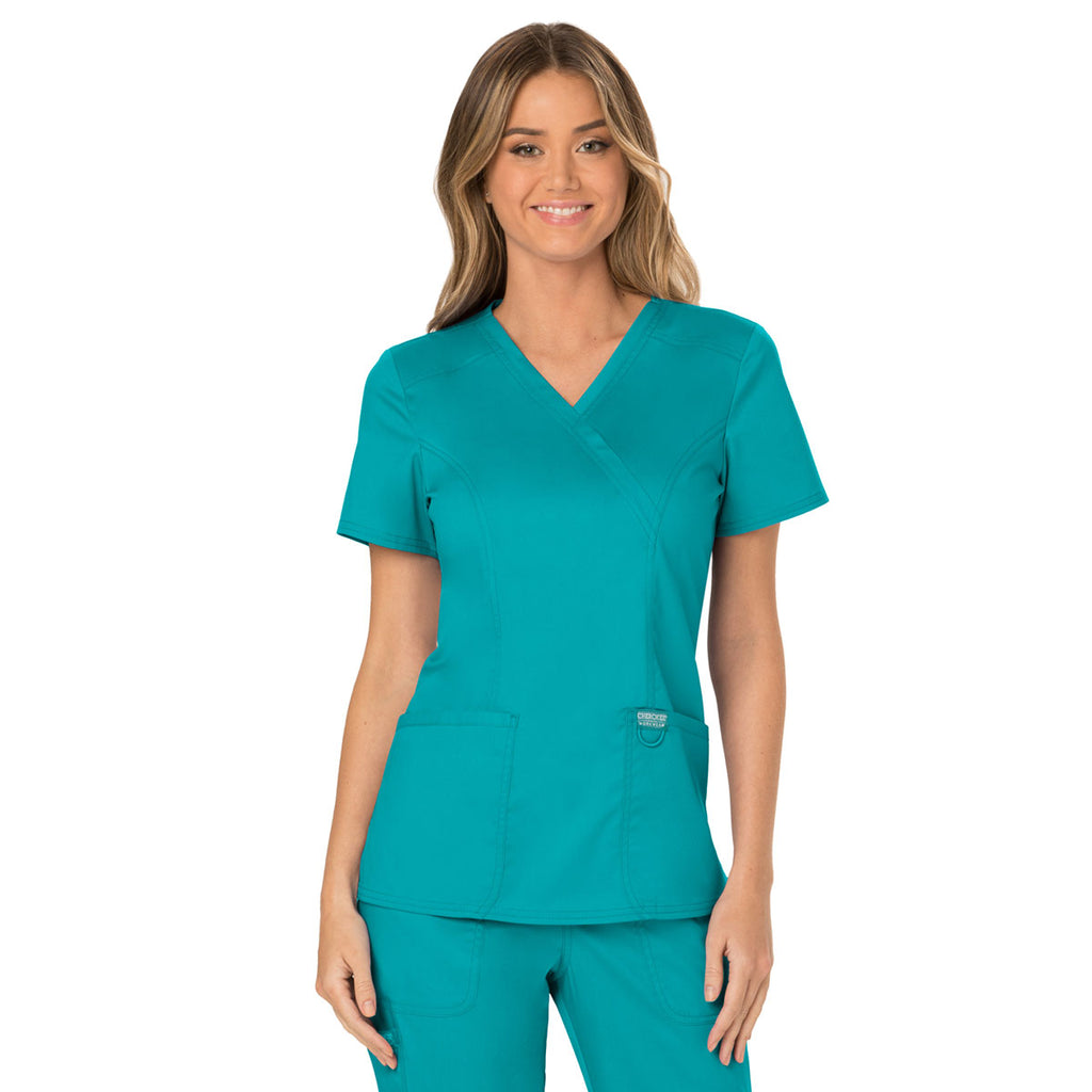 Cherokee Women's Teal Blue Workwear Revolution Mock Wrap Top