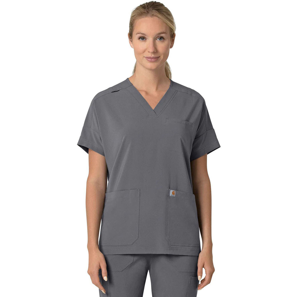 Carhartt Women's Pewter Four-Pocket Oversized V-Neck Top with a corporate logo is the modern fitting scrub top that will keep you comfortable all day. The details on this top are what make it unique, including the raceback detail and back pleat. Perfect for nurses, doctors, masseuse, and anyone else who needs comfortable professional clothing at work.Highlights